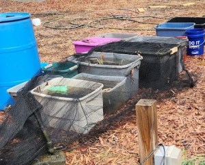Did the confusion of the fish turn to apprehension as they were chased around the pond with a net in the decreasing amount of water and then deposited into small tubs?  If they were crowded before, they were now packed almost fin to fin. No more swimming laps around the pond. In this new place, they barely have room to swish their tails five times. Not only that, but they are covered by a net to keep them from jumping out and to keep them safe from birds and the neighbor’s cat.
