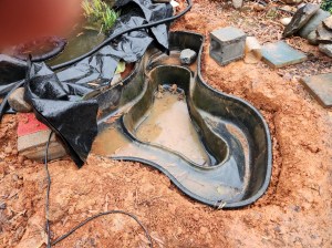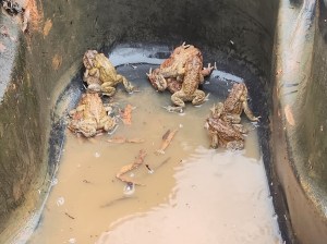 The loud croaking of toads – I mean the LOUD croaking of toads drew me towards the plastic fish pond next to the larger dug-out pond. I had drained and cleaned the smaller one in preparation of lining it when I lined the larger pond but then abandoned it when the lining wasn’t long enough to cover both. My neglect was evident as I looked into the muddy rain water that now dirtied the pond. Clay is horrible to clean. It stains everything it touches. Because I had not protected the pond, I would now have to drain it again and ruin more towels when the new liner arrived.