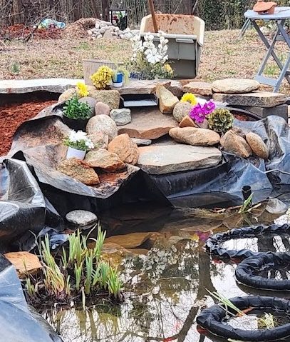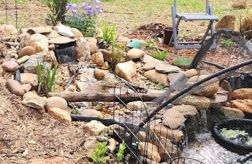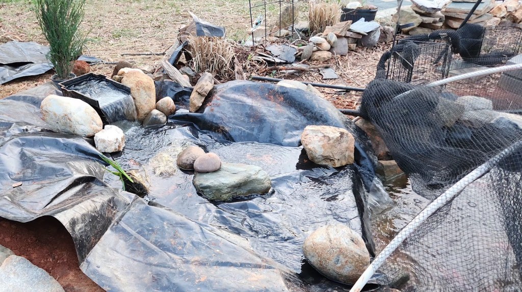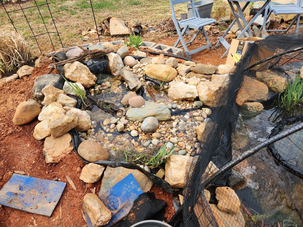 So I started over. Again. I removed everything, including the lining. I dug out the area a lot deeper before putting the liner back on it, kept the waterfall one level, and covered every part of the lining with rocks and stones and a few branches. A few harder- to-cover places were left for plants to cover. It didn’t have the nice, bubbling streams as the last waterfall, but it was nice enough. The water flowed quietly in several directions before splashing into the pond. There were plenty of places to add plants, including a couple of deeper pools. But there was one problem. I had gotten carried away and now it was too big for my pond. It looked huge. It was even bigger than my first waterfall.